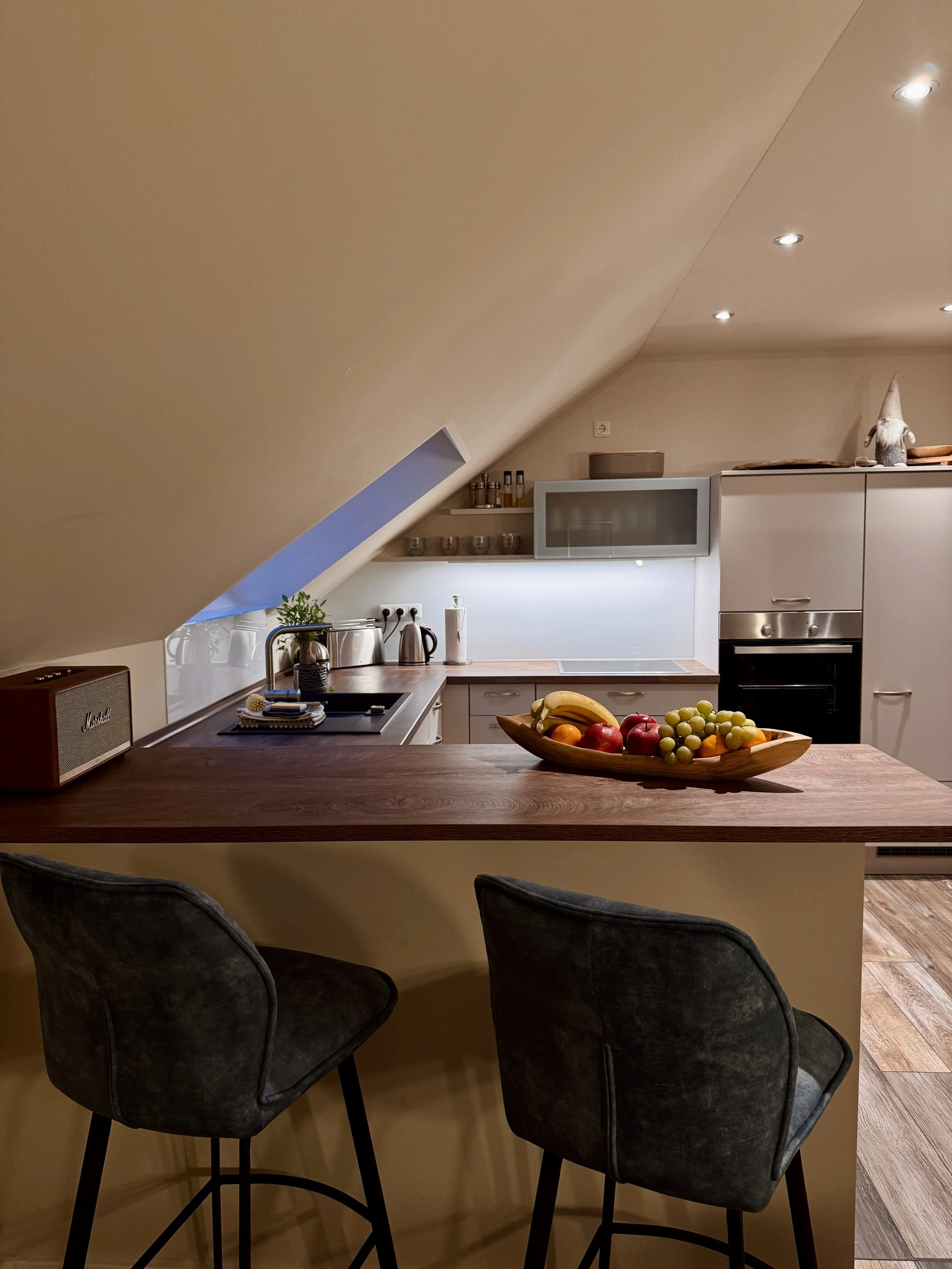 In den Ferienwohnung Chris 1+2 sind die Küchen bestens ausgestattet mit einer Geschirrspülmaschine, einem Kühlschrank mit Gefrierfach, einem großen Toaster, Eierkocher, Wasserkocher und einer Kaffeemaschine von CoffeePerfect, die eine große Auswahl an Kaffeespezialitäten bietet. Mit 80 Küchenutensilien, sechs Töpfen und Pfannen, hochwertigem Geschirr und Gläsern ist für jeden Bedarf gesorgt. WLAN ist selbstverständlich kostenlos verfügbar, ebenso wie ein tragbarer Bluetooth-Lautsprecher und ein CD- und Radioplayer. Für zusätzlichen Komfort gibt es einen Wirtschaftsraum mit Staubsauger, Bügeleisen, Bügelbrett und Putzutensilien.